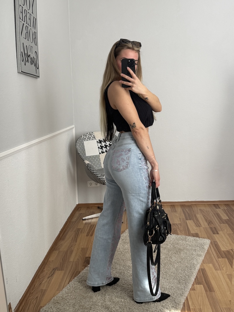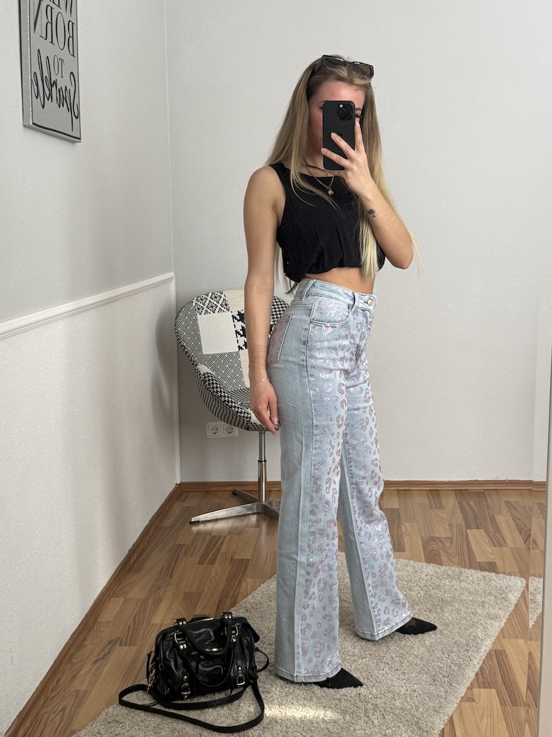Styling-Tipp: Kombiniere die Leo Strass Jeans mit einem schlichten Top oder Crop Top, damit das Design im Fokus bleibt. Eine schwarze Tasche und dezente Accessoires runden den Look perfekt ab – clean, aber trotzdem auffällig.