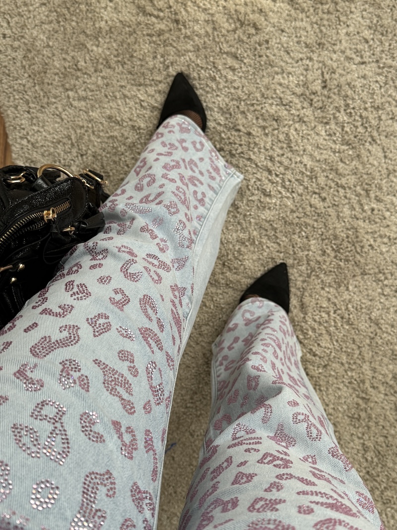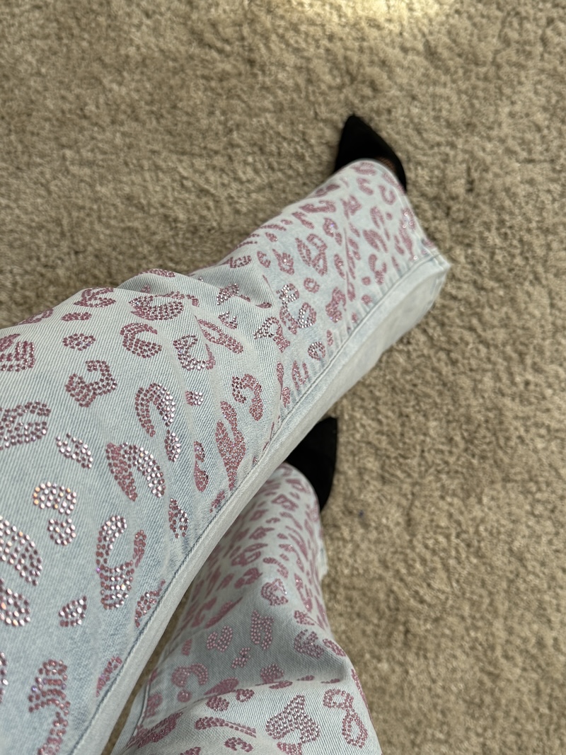 Das Highlight dieser Jeans ist ganz klar das aufwendig verarbeitete Leo-Strass-Muster. Auf der Vorderseite zieht sich das funkelnde Leo-Design aus rosa Strasssteinen von oben bis unten und sorgt für einen echten Wow-Effekt bei jedem Schritt. Je nach Lichteinfall beginnt die Hose dezent zu glitzern und macht dein Outfit sofort zum Hingucker. Auf der Rückseite wird das Design stilvoll aufgegriffen: Hier finden sich die Strassdetails im Leo-Look auf den Gesäßtaschen wieder und setzen einen edlen Akzent.
