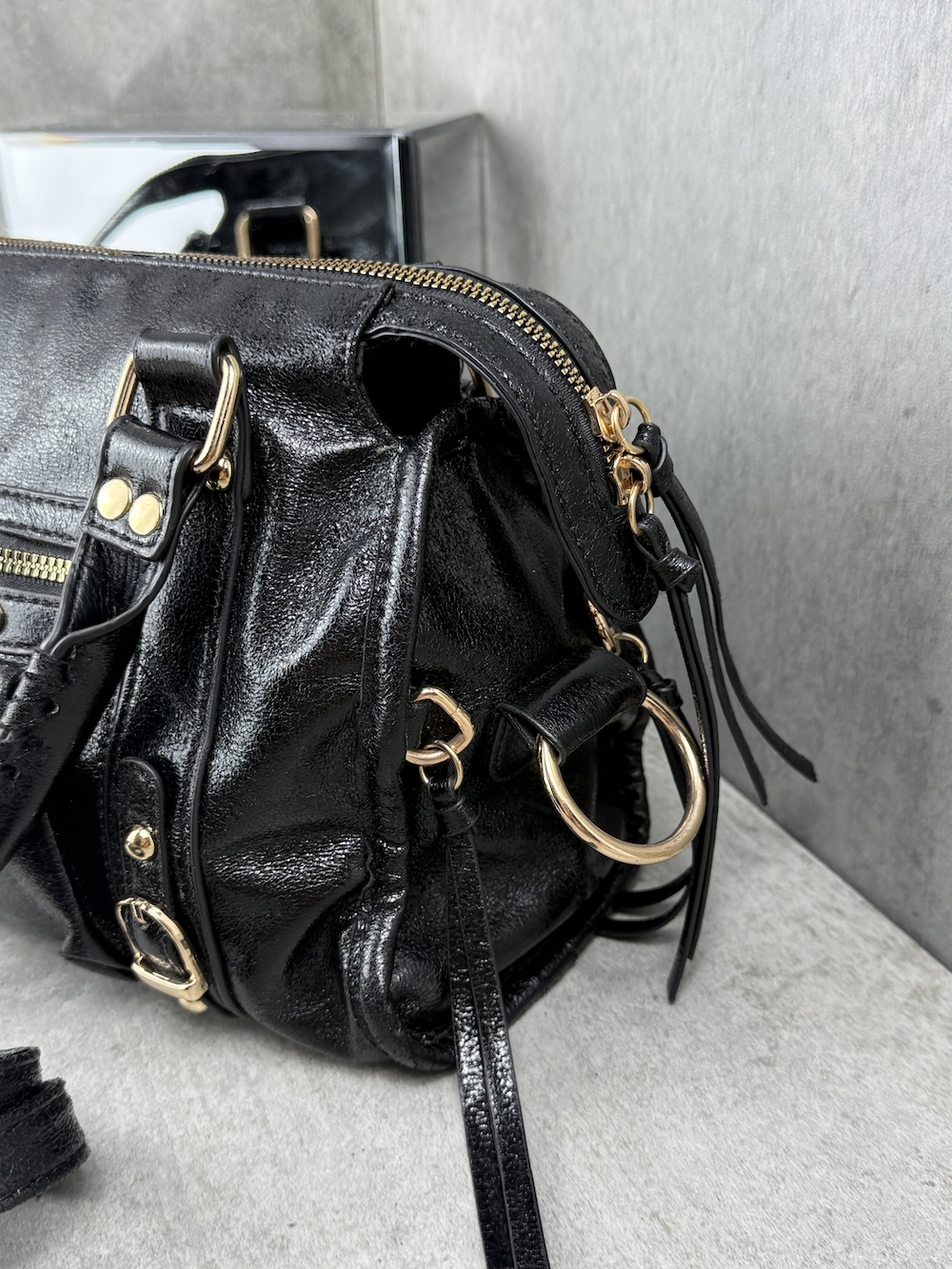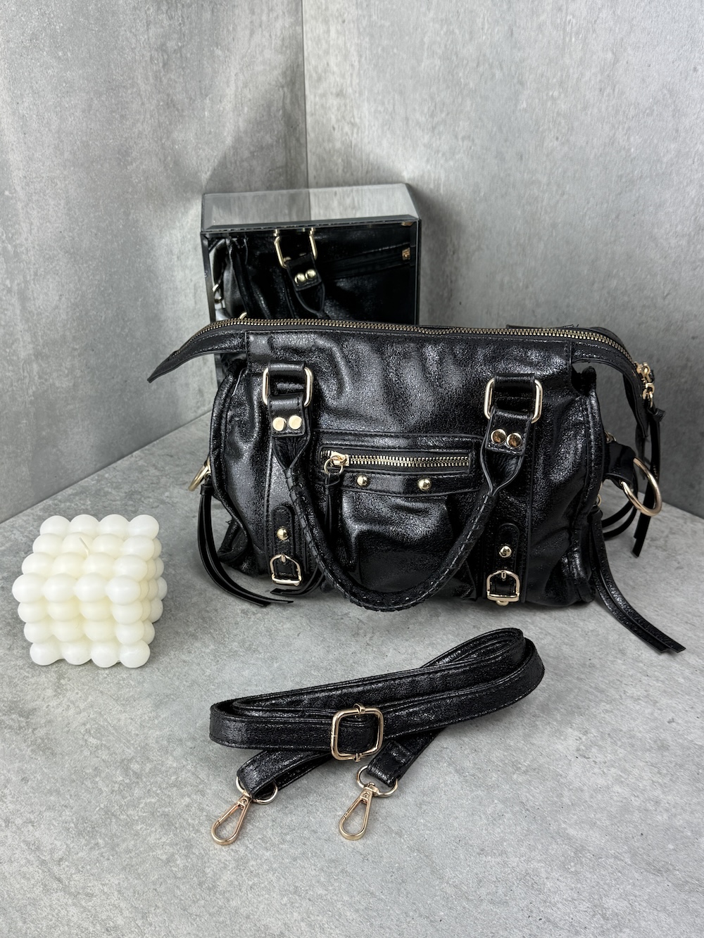 Diese schwarze Metallic Handtasche ist das perfekte Accessoire für alle, die Stil, Funktionalität und Eleganz vereinen möchten. Mit ihrer glänzenden Oberfläche im edlen Metallic-Look verleiht sie jedem Outfit das gewisse Extra – ob im Alltag, beim Stadtbummel oder beim Ausgehen am Abend. Die hochwertigen goldfarbenen Details und Zipper runden das Design perfekt ab und sorgen für einen luxuriösen Touch, der sofort ins Auge fällt.